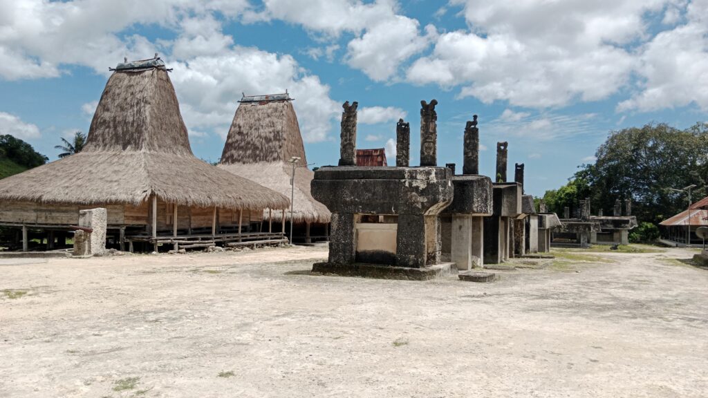 Our project leader picked us up at the airport after a six-hour journey from his hometown and took us to a good, safe hotel. On the way, we saw quite a few people on motorbikes carrying enormous knives, and the enormous graves for the deceased in the front yards of their houses. The houses and graves are built with enormous, pointed roofs, so that the gods/spirits can dwell there. The next morning, we first visited one of these primitive communities. We were allowed to enter a bamboo house and learned about the rituals and customs of the Marapu faith, in which animism plays a significant role. In some houses, the deceased are embalmed and laid out for years until there is enough money for the funeral rituals and to buy a grave. Countless pig jaws and a kind of dream catcher hang from the ceiling inside.